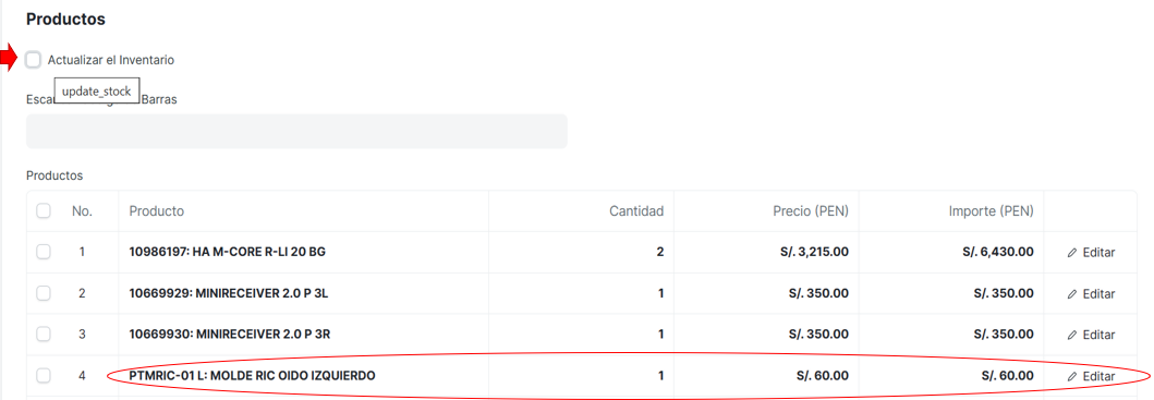 Nota: Si la nota de crédito se muestra sin el check de actualizar el inventario (que se ubica en la parte superior de la tabla de productos) despues de emitida la n/c se deberá comunicar al Area de Almacén para que realice el retorno.
