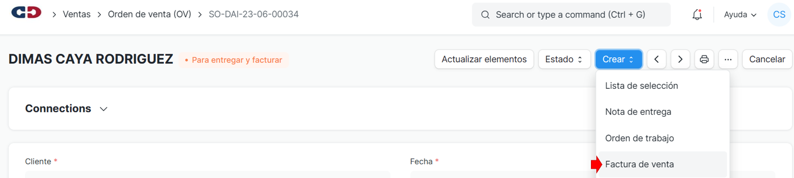1.Ingresar al link de la OV, en la opción crear seleccionar Factura de venta: