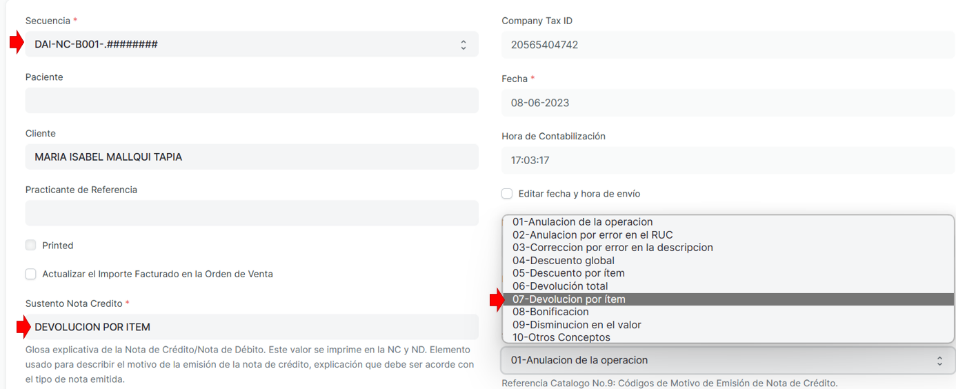 - Escribir el sustento Nota de credito.