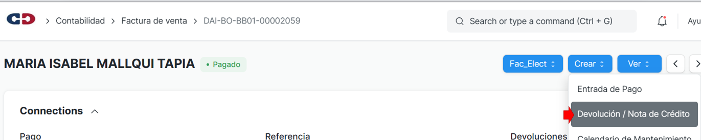 2.Ir a la opcion crear y seleccionar Devolucion/ Nota de credito: