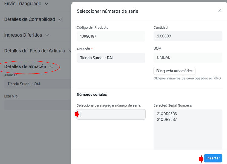 - En la opcion Editar de la linea del producto, se abrirá una venta emergente para ingresar el numero de serie: