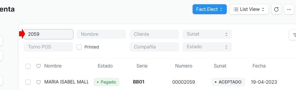 1.Ir al modulo ventas y ubicar en el sistema el número de la boleta/ factura electronica para emitir su nota de credito: