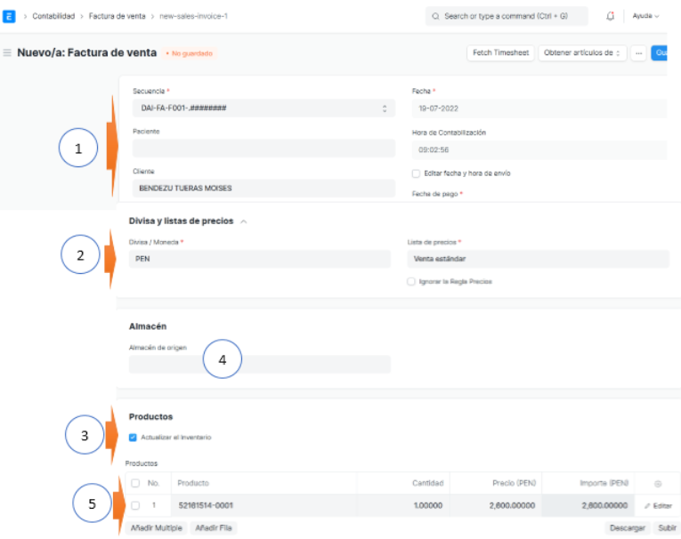 3.Marcar con un check en Actualizar el inventario ( descontará del almacén una vez producida la venta)