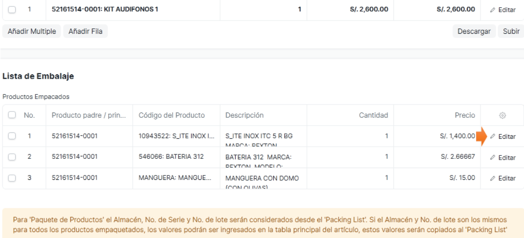 1. En la sección Lista de Embalaje, se seleccionará el artículo que requiere numero de serie o lote, haciendo clic en editar