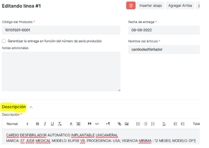 5.Para detallar más sobre el producto, dirigirse a la linea del producto, clic en editar en Descripción: